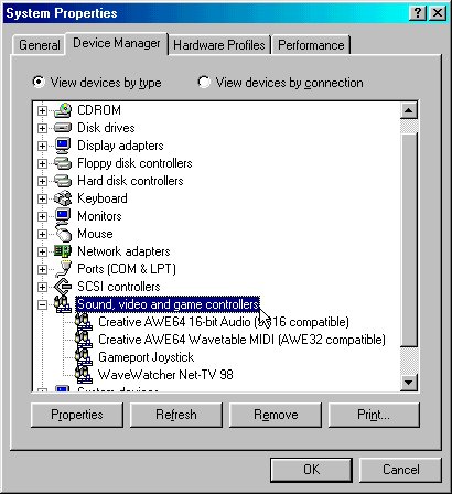 | Double click on Sound, video and game controller to open up the list as shown here. Or select it and click the Properties button at the bottom. |