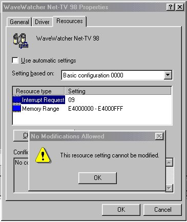You should now be looking at the list of IRQ’s under the View Resources (IRQ) tab. Look down the list to find the WaveWatcher TV–PCI or WaveWatcher Net-TV 98 card. If you do not see the WaveWatcher driver listed, it was not installed correctly. Restart your system and try again with the installation. You should see ONLY ONE device assigned to the IRQ shown in front of the WaveWatcher card entry. The only exception to the rule is the Holder for PCI Steering. This is not considered a device and will not cause a conflict with the IRQ. In the above picture you will see that the WaveWatcher card and the IRQ holder for PCI Steering are using IRQ 9. This is what you want to see. It doesn't matter which IRQ the TV card and the Holder for PCI Steering are using, but they need to be the only two things listed on that IRQ.